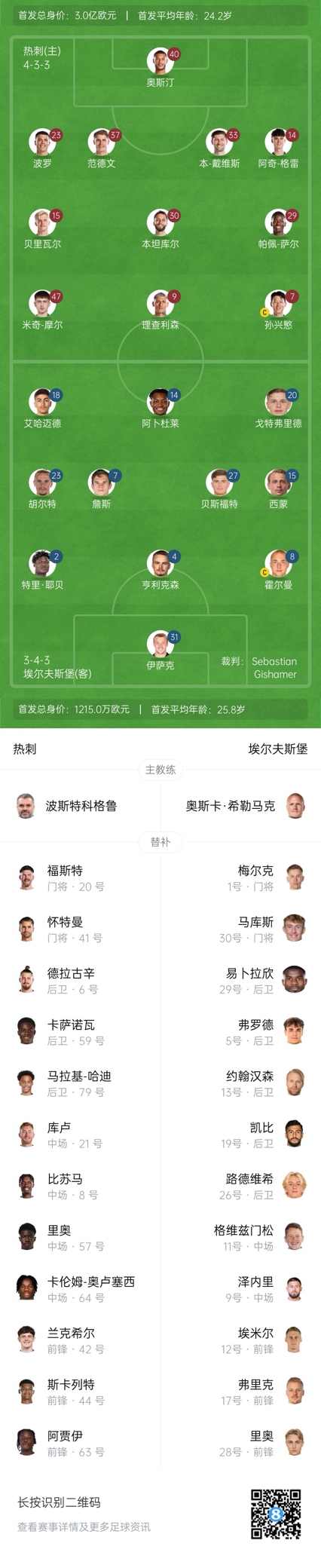 热刺替补:20-福斯特、41-怀特曼、6-德拉古辛、8-比苏马、21-库鲁塞夫斯基、42-兰克希尔、44-斯卡利、57-凯雷马滕、59-卡萨诺瓦、63-阿贾伊、64-奥卢塞斯、79-哈迪